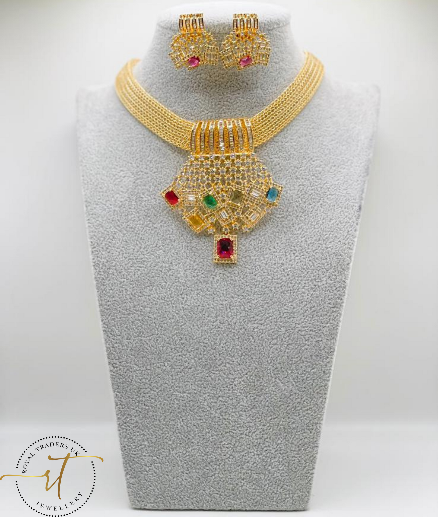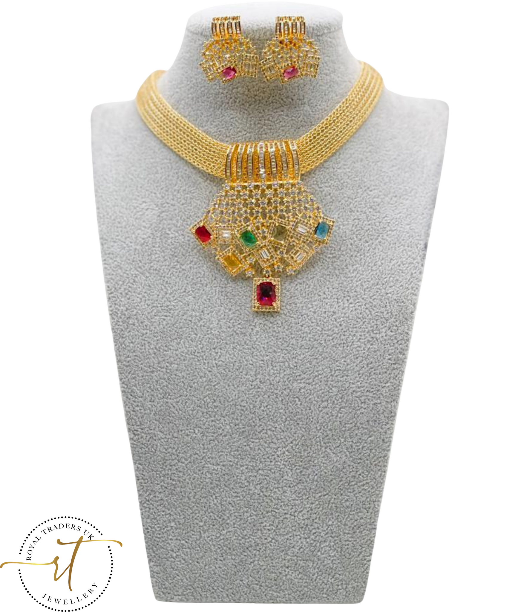Stunning American Diamond set of Necklace and Earrings in gold with green, red and white stones.