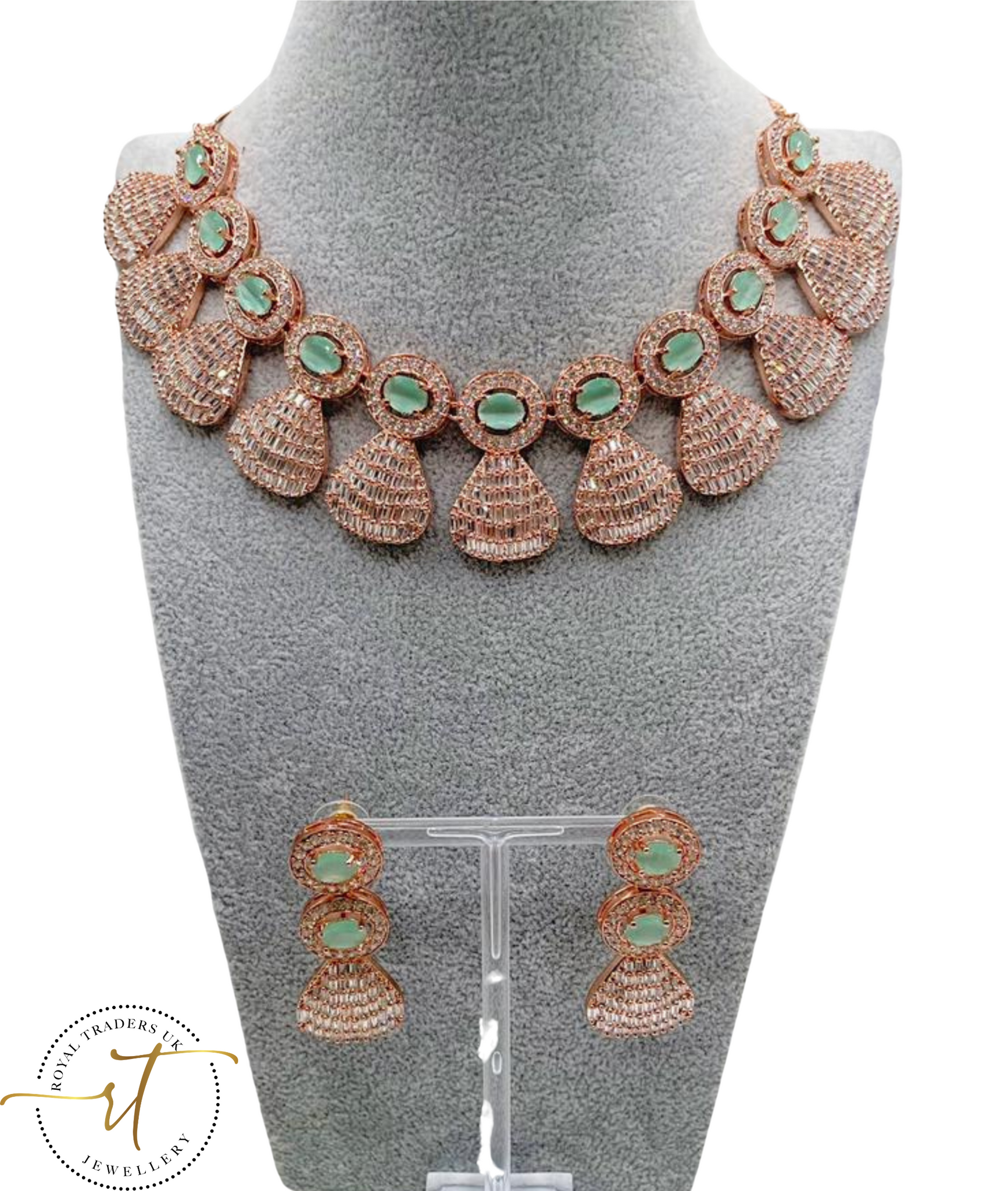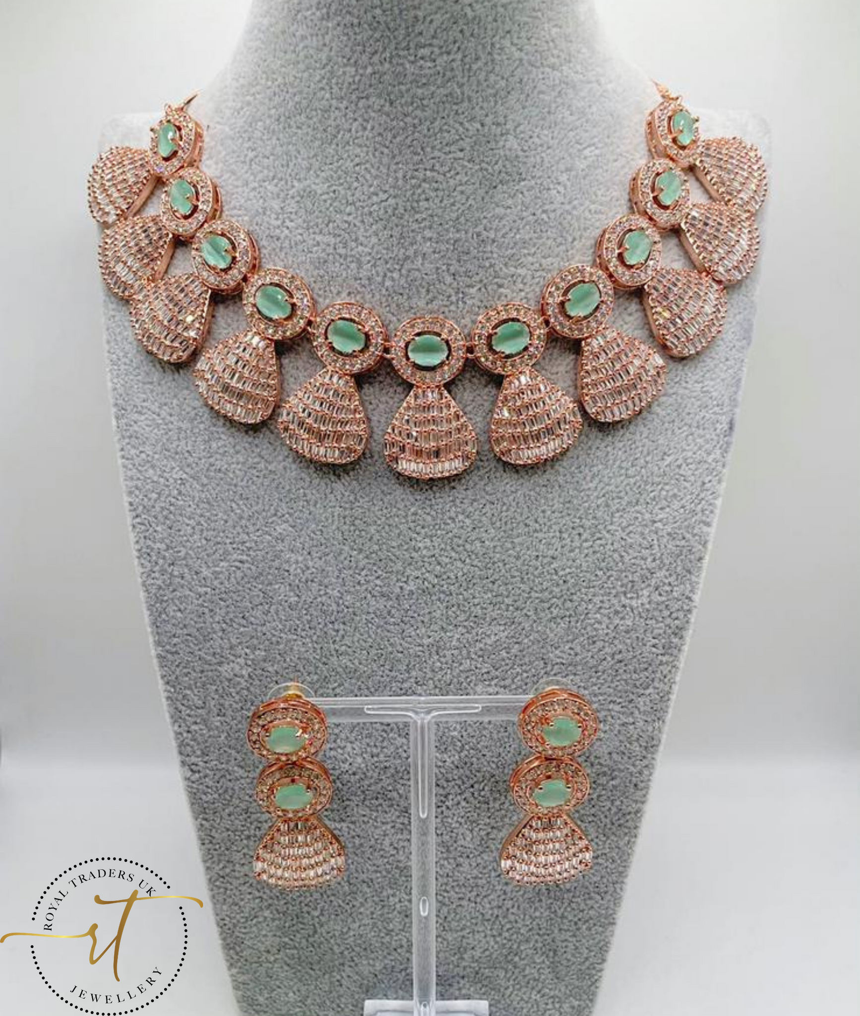 Freya - American Diamond Rose Gold and Green Stone Necklace and Earrings