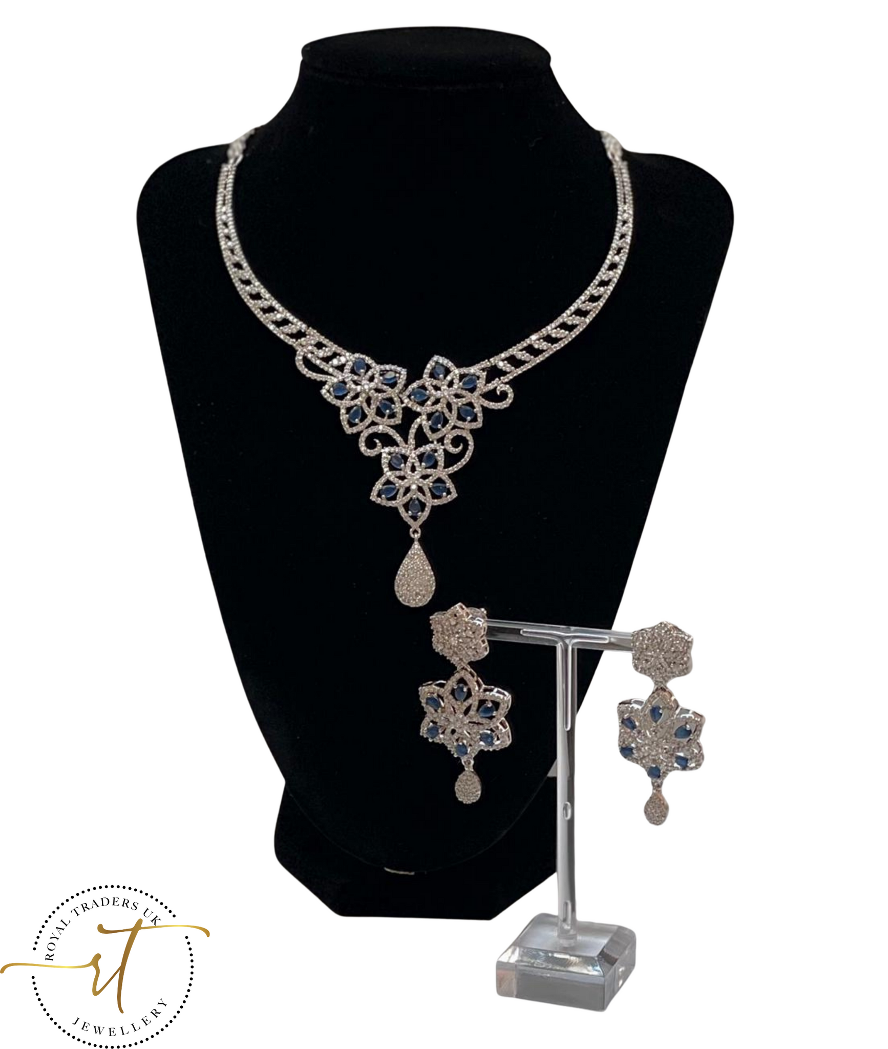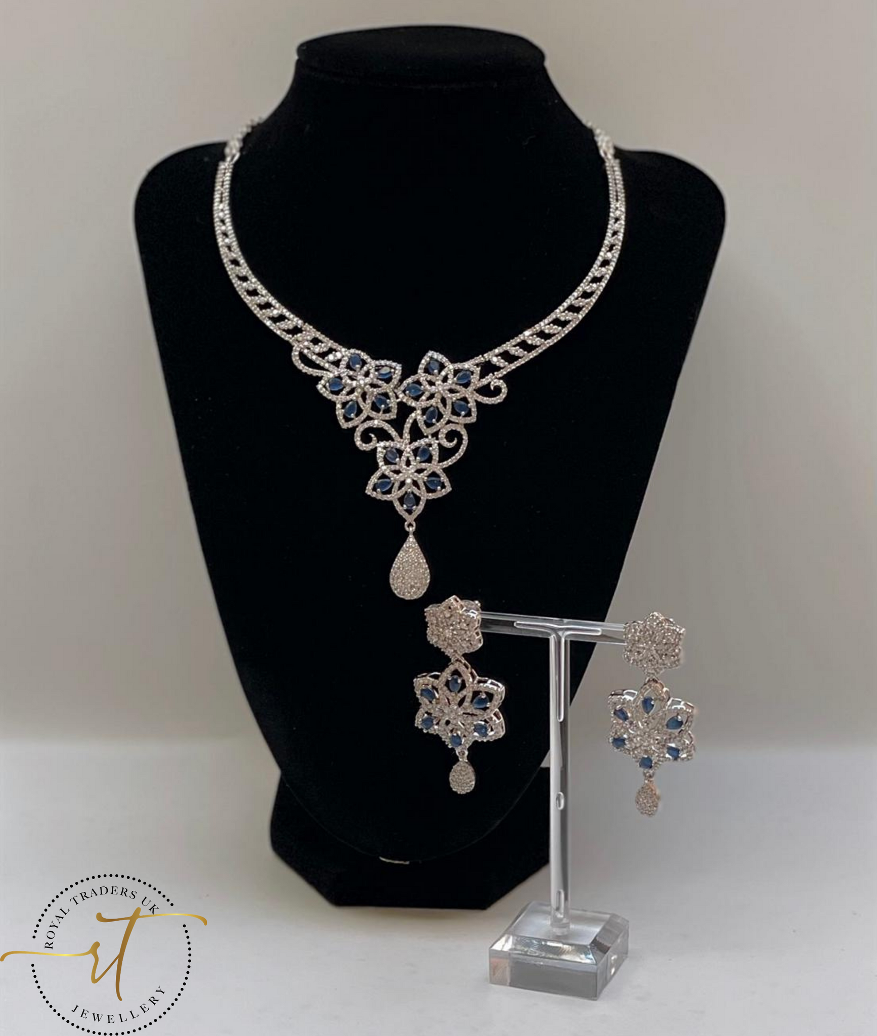 Stunning American Diamond Pendant Necklace and Earrings Set with a hint of Sapphire Crystals.